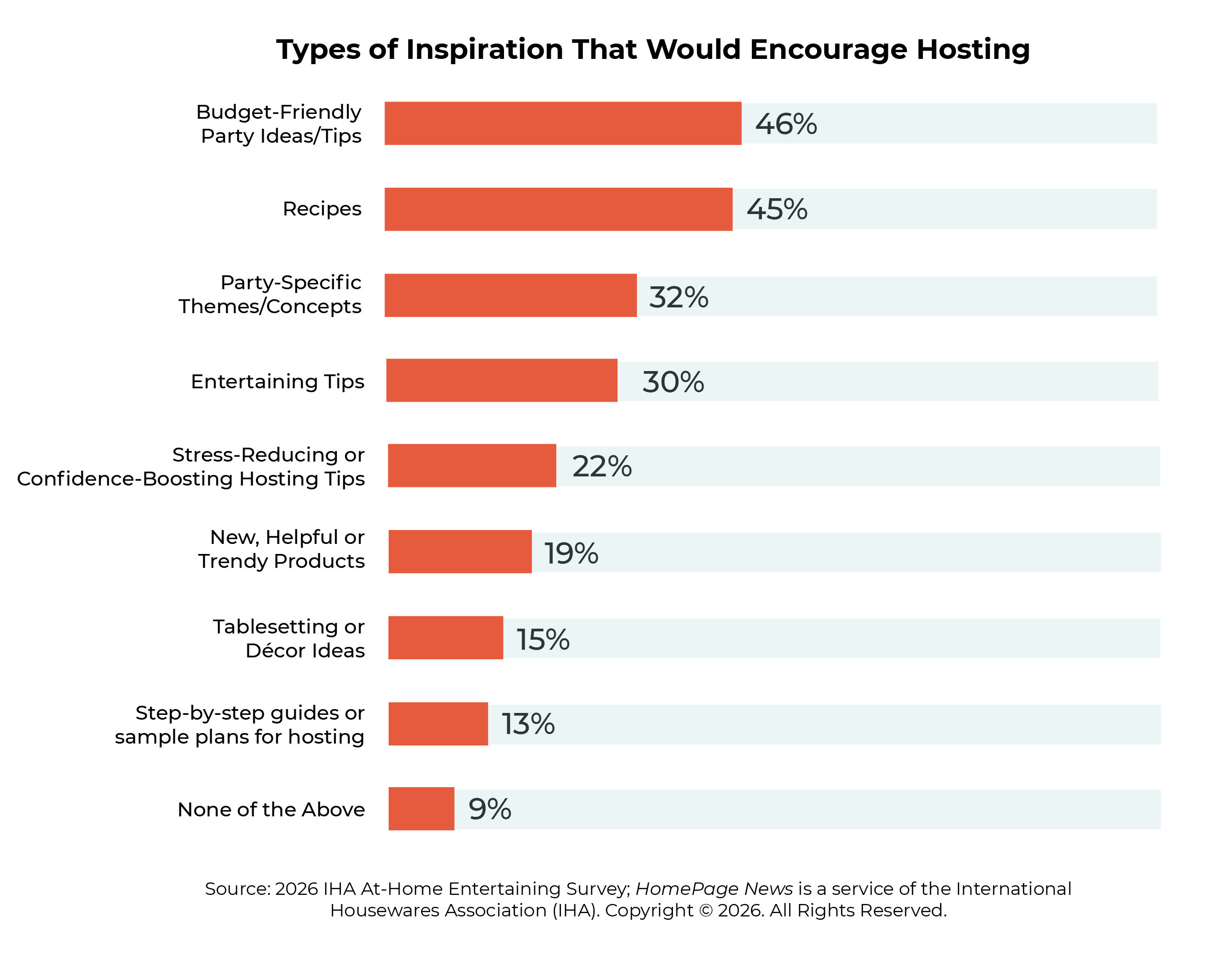 * When asked what would inspire them to host more at-home gatherings, budget-friendly party ideas topped the list (46%). Recipes were almost as popular (45%), with party-specific theme ideas (32%) and general entertaining tips (30%) coming in next.