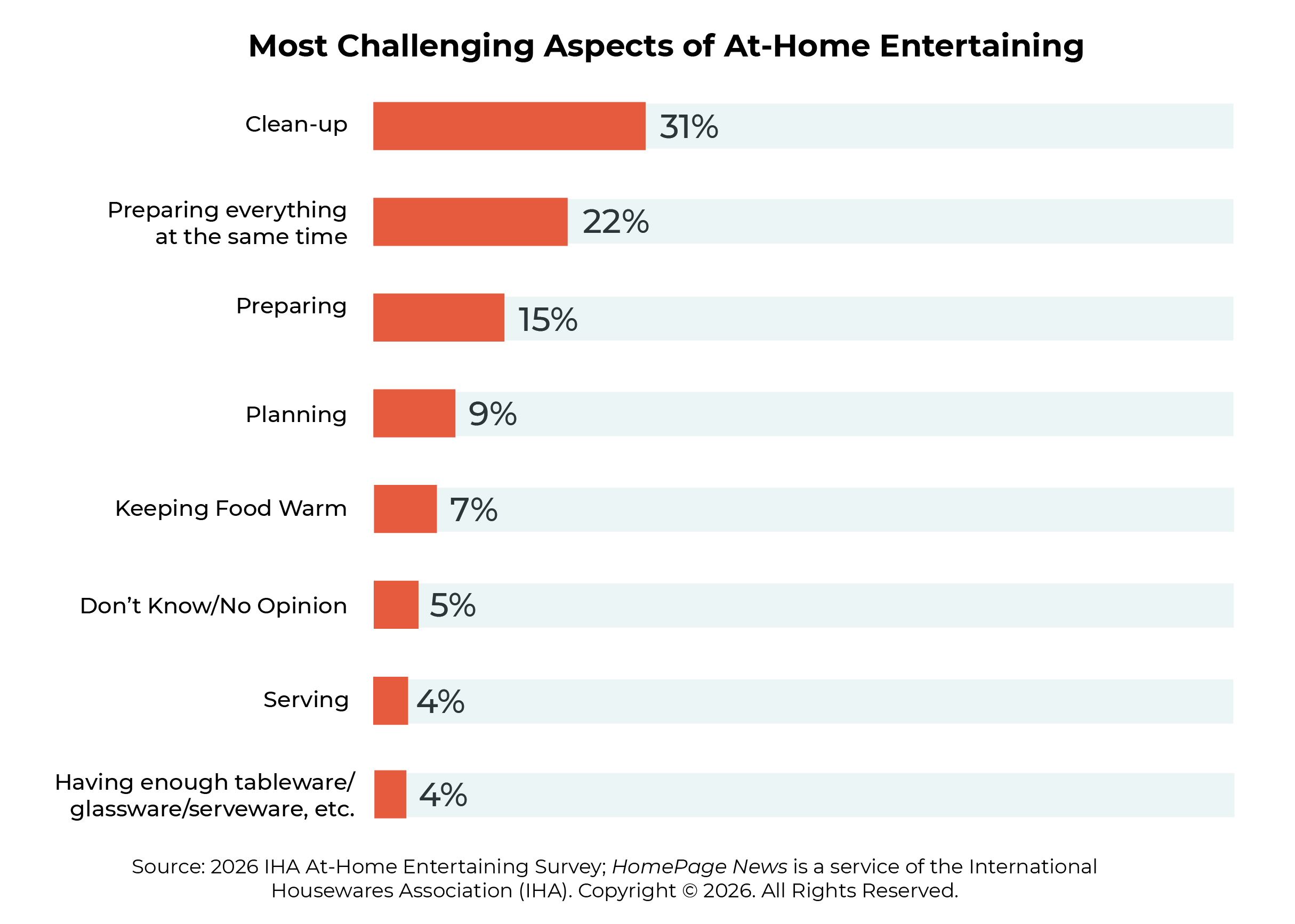 Other findings include: * Clean-up is the biggest challenge for at-home hosts (31%), followed by preparing everything at the same time (22%), cooking (15%), planning (9%) and keeping food warm (7%).