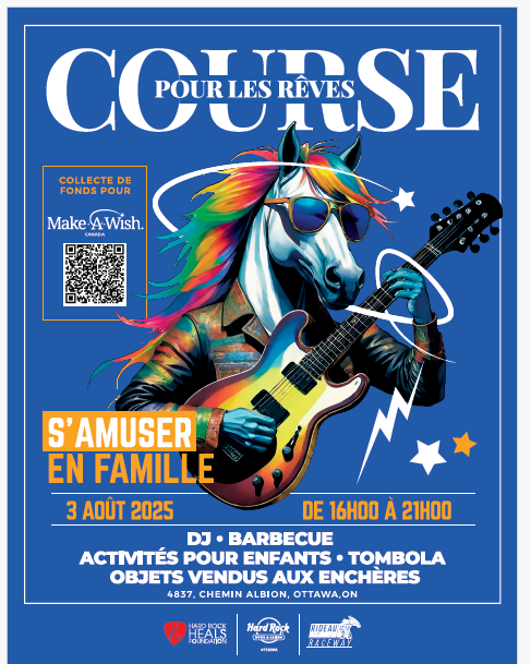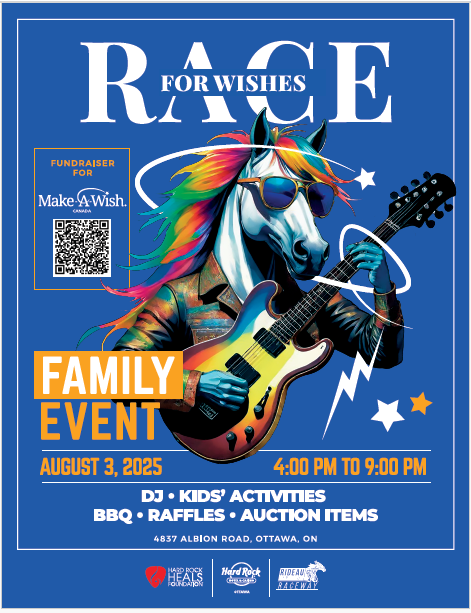 Date: Saturday, August 3, 2025 Time: 4:00 PM – 9:00 PM Location: Racetrack Area – Hard Rock Hotel & Casino Ottawa Event Overview Hard Rock Hotel & Casino Ottawa proudly presents Race for Wishes — a high-energy, family-friendly fundraiser with a powerful mission: to raise $30,000 and grant three life-changing wishes for children in the National Capital Region facing critical illnesses.